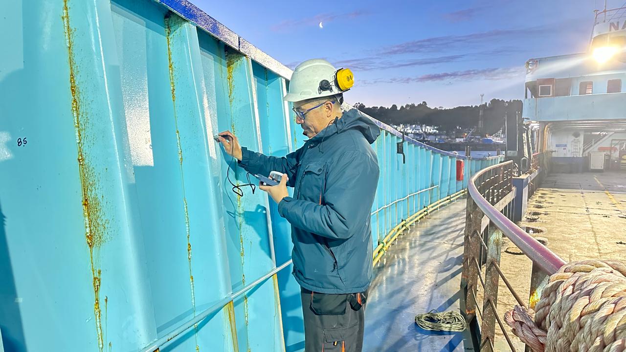 Levantamiento en terreno y medición de espesores de casco y superestructura, aplicando equipos de ultrasonido y registro de datos técnicos para modelación posterior.